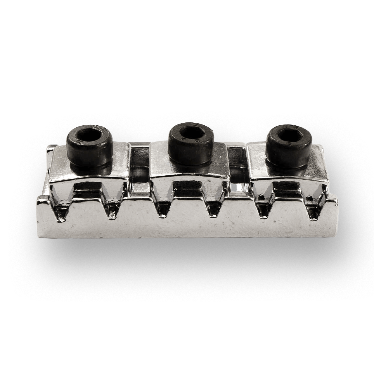 Chrome angled metal locking guitar nut for enhanced tuning stability alongside a tremolo