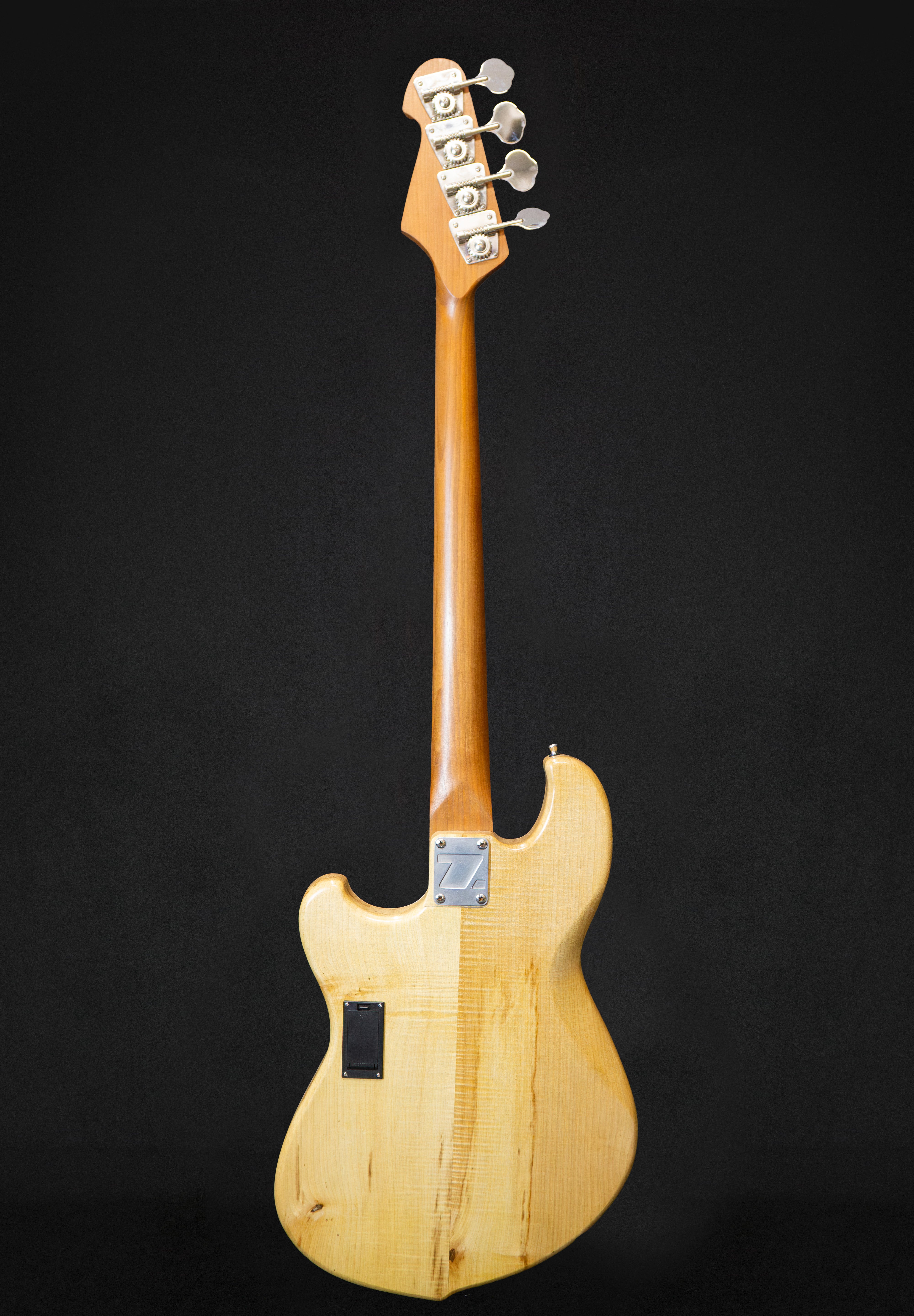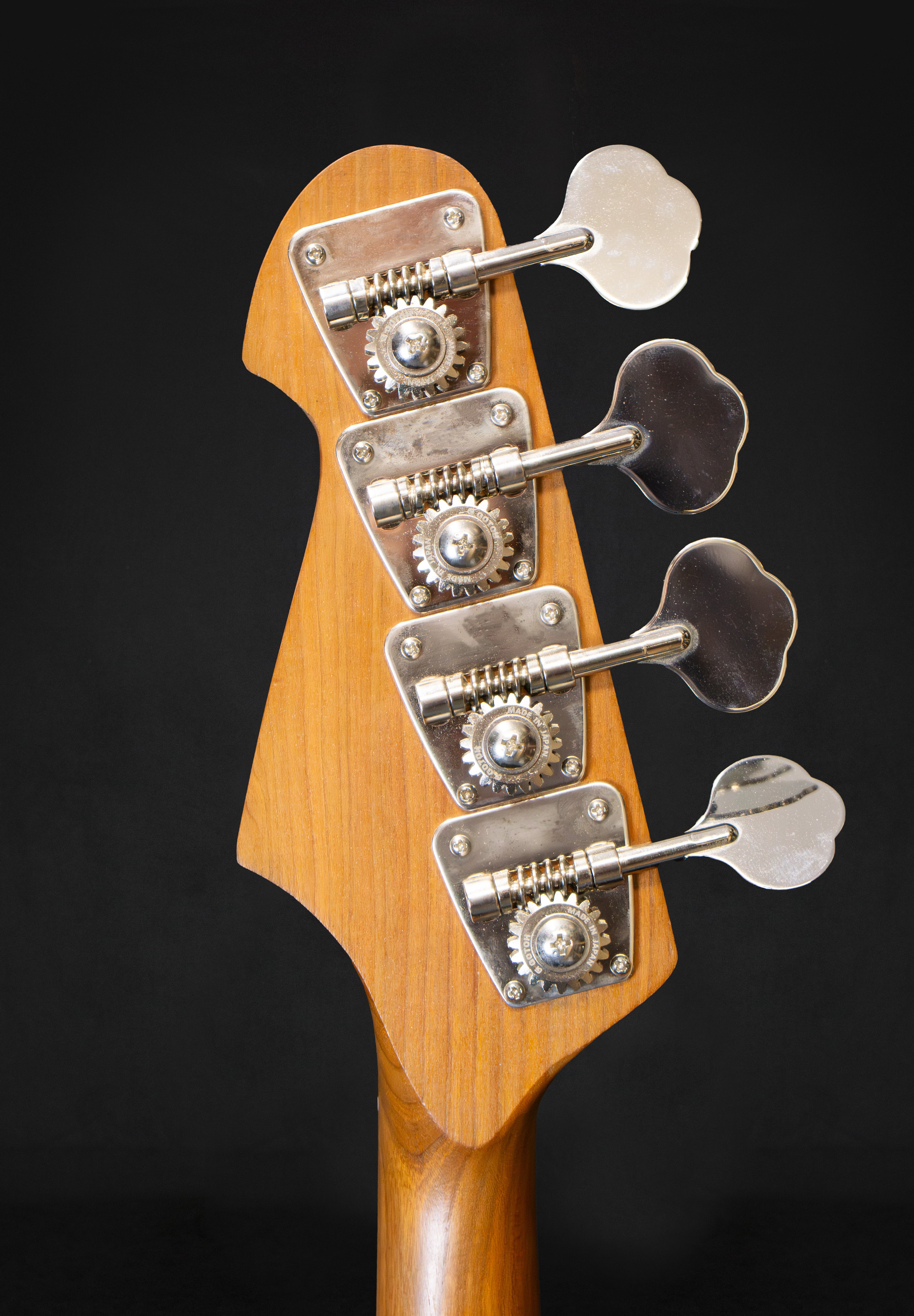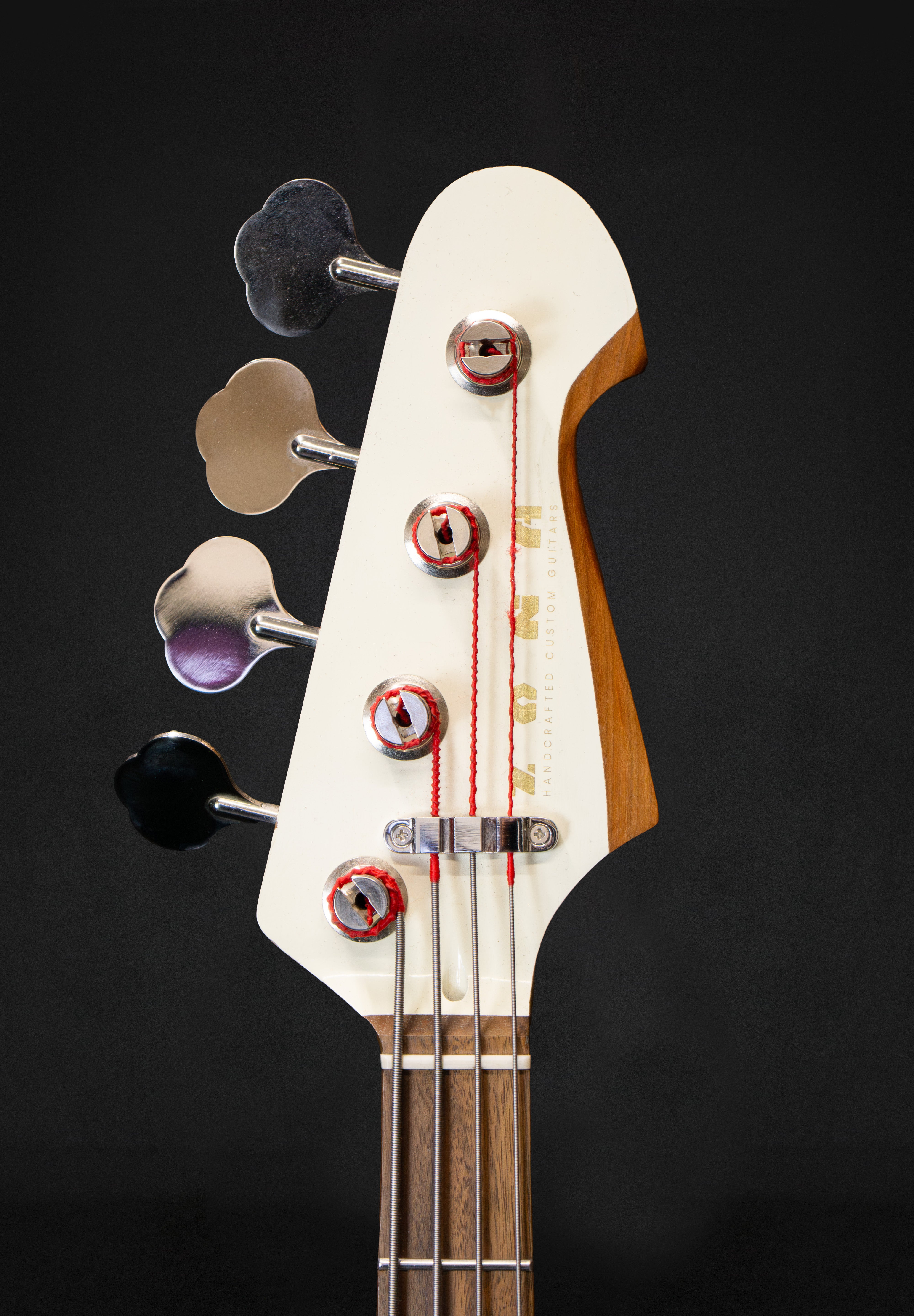 This bass is loaded with custom and premium hardware, including Gotoh vintage tuners, a Hipshot string guide, bone nut, stainless steel frets, and an aged white pickguard. The electronics feature a Zona hand-wound bass humbucker, ±12dB active EQ for bass and treble, and a vintage loom with a Switchcraft socket, all mounted on a brushed aluminium composite control plate. A polished aluminium Fenrir top-mounted bridge, Zona aluminium neck plate, and vintage-style aluminium knobs complete this unique and meticulously crafted instrument. Designed for players who value tone, feel, and individuality.