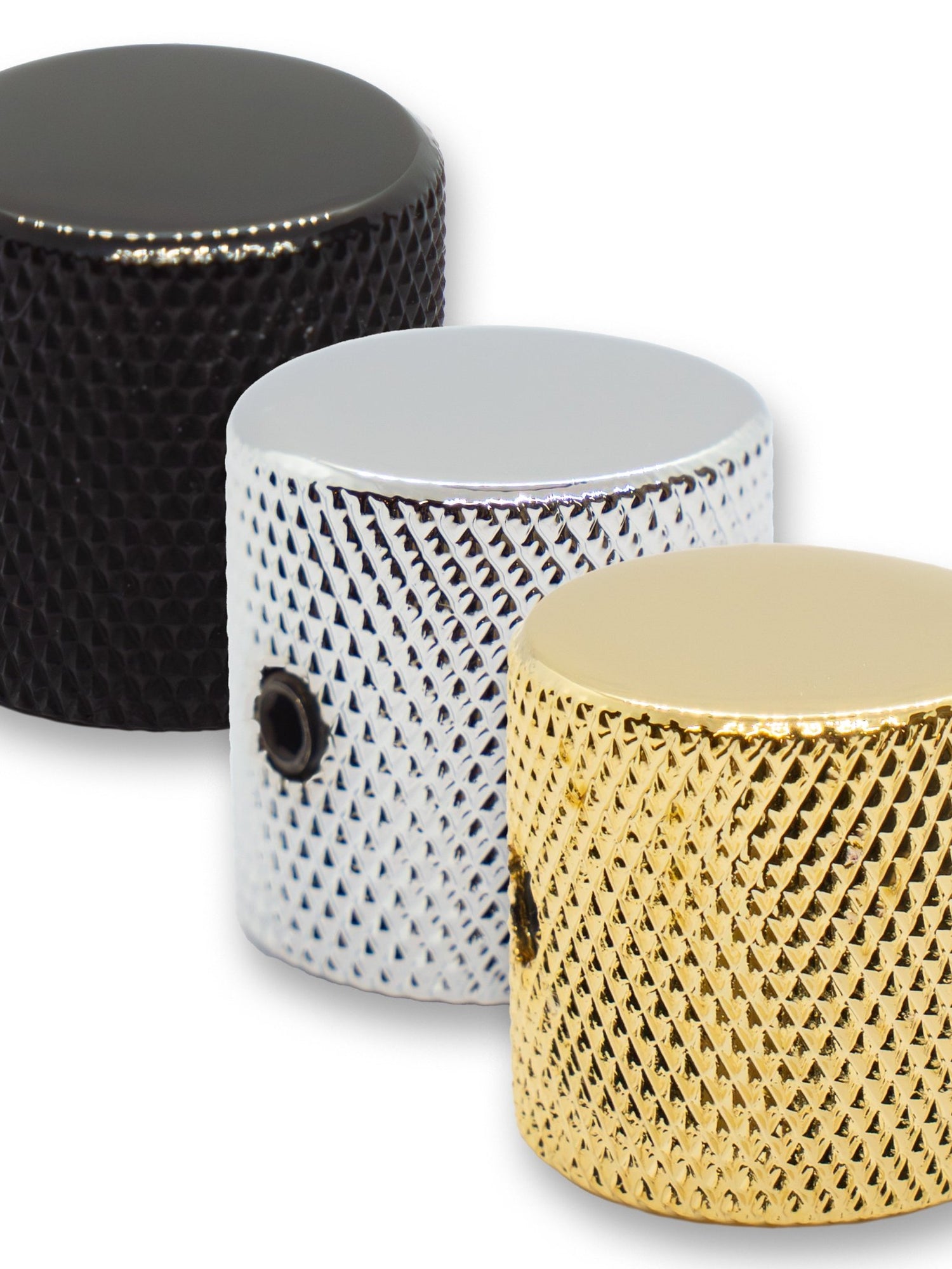A classic-style pair of knurled flat top control knobs, ideal for Telecasters, P Basses, and other guitars or basses with solid shaft pots. These metal knobs provide a secure grip and clean look—perfect for replacements, upgrades, or custom builds.