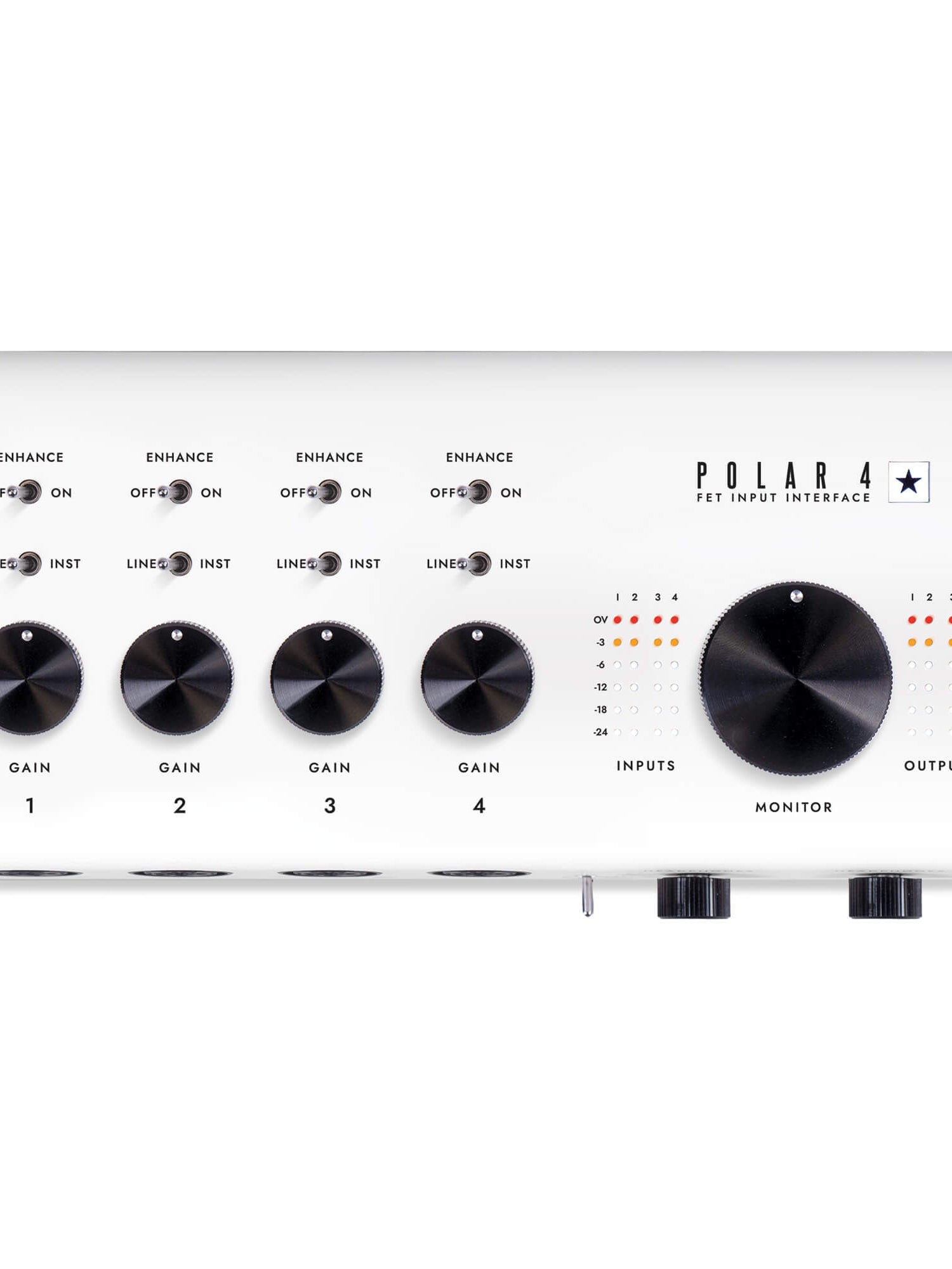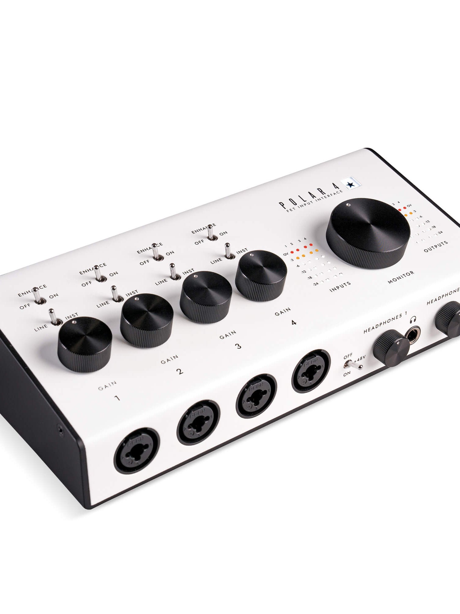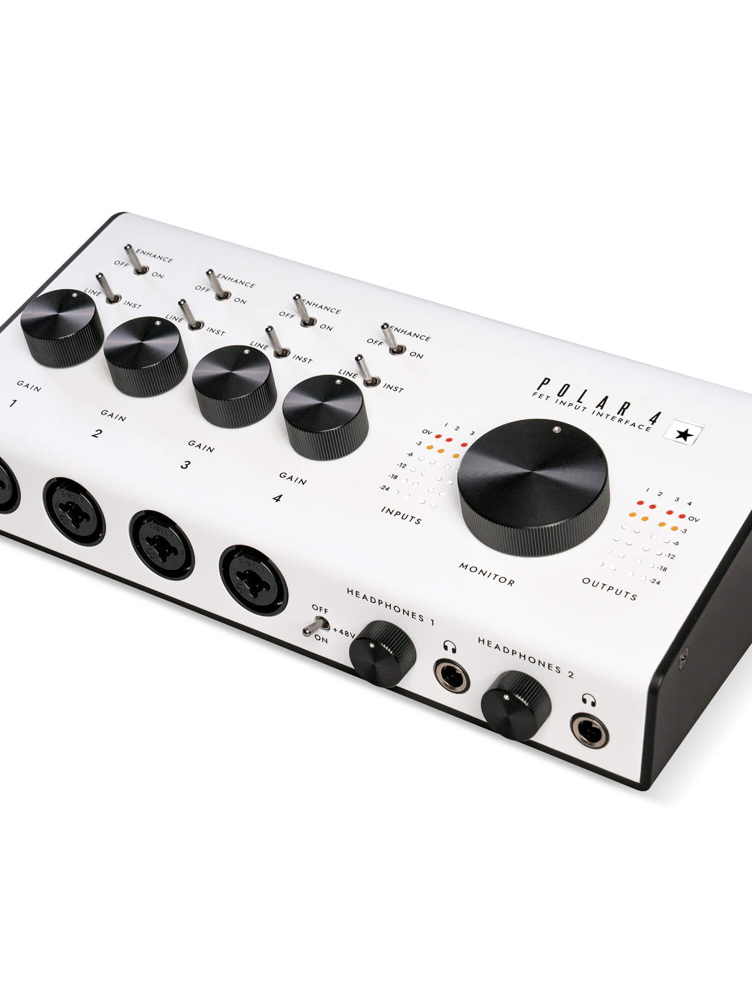 POLAR 4 is a 4 channel USB audio interface built by guitarists for guitarists. It features 4 high headroom FET input channels for instrument, line and microphone, two high output headphone outputs, +48V phantom power for condenser microphones, balanced outputs for professional monitoring, visual level meters, a MIDI In and Out port and the proprietary “Enhance” switch.
