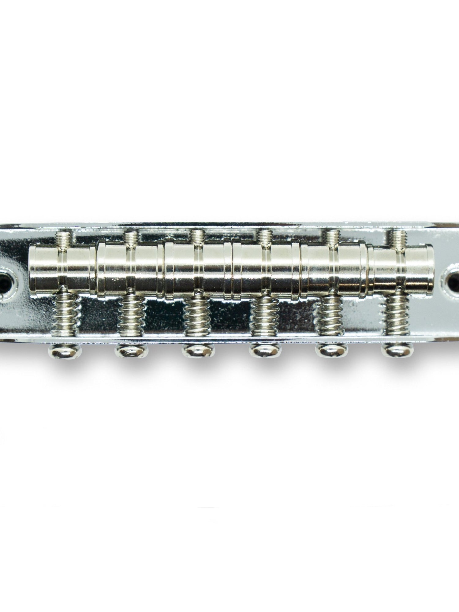 This replacement bridge is designed to fit Fender Jaguar, Mustang, and Jazzmaster guitars with a 55.5mm string spacing, offering improved tuning stability and playability while maintaining classic offset aesthetics. Made from chrome-plated steel, it features vintage-style threaded saddles for precise string alignment and authentic tonal response.
