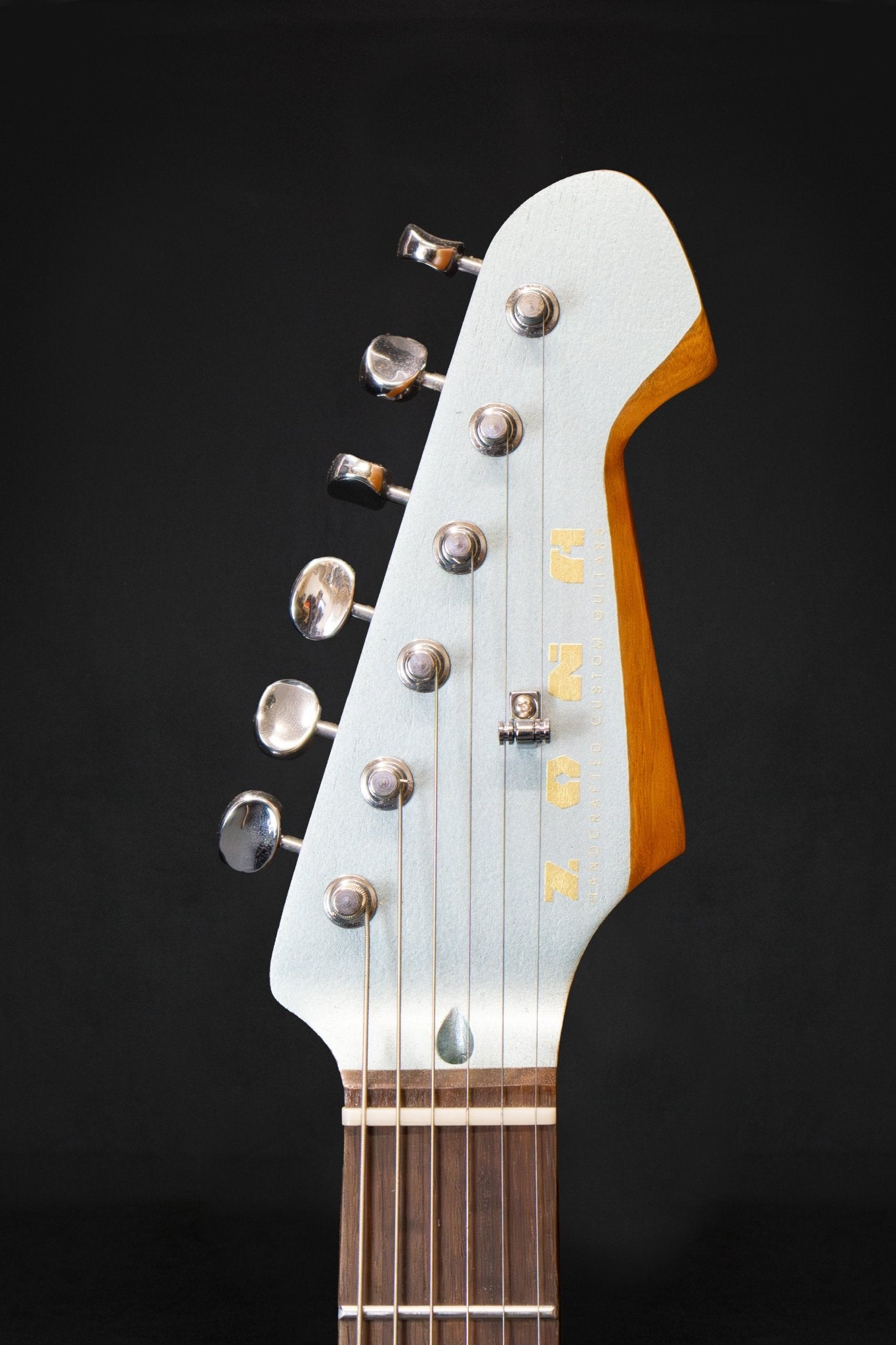 The Zona Isca Custom "Ice Blue" is a meticulously crafted electric guitar, handmade in Devon with a unique blend of traditional tonewoods and modern design elements. Featuring a cherry body with an oak top, it sports an ice blue nitrocellulose finish on the front, contrasted by a light satin nitro cherry back for a beautifully organic two-tone look. The cherry C-carve neck and walnut fretboard with stainless steel frets offer a smooth, fast-playing experience, while the matching headstock ties the visual aesthetic together.