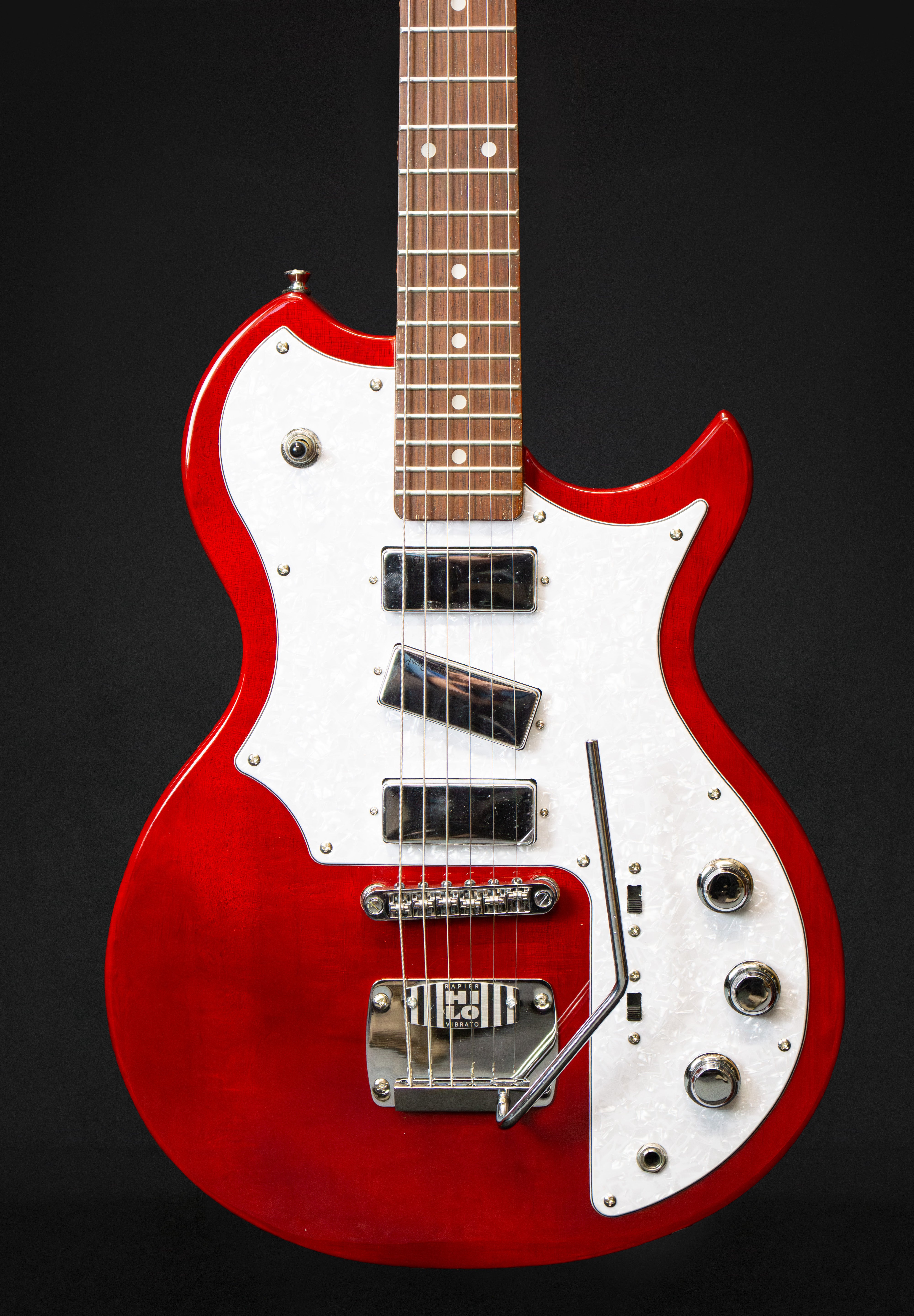 Whilst maintaining all the visual charm of the originals, like all models in the Rapier Series, the Rapier Deluxe features significant upgrades to meet the needs of the modern player. These include okoume the chosen tonewood for the body, a maple neck and 22 fret jatoba fingerboard, modern hardware includes a sensitive Hi Lo vibrato system where stable tuning and accurate intonation and return to pitch are spot on every time, via Wilkinson machine heads, a precision cut GraphTech nut and a fully adjustable roller bridge.